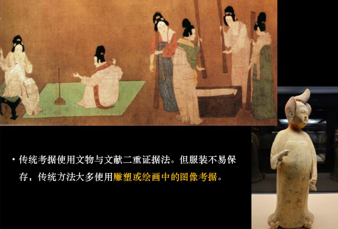 第二部分,真实与想象的关系。这是祁老师的重点介绍部分。“层叠的历史与永远触摸不到的复古梦”是祁老师给出的一个小标题。面对后代文学作品、绘画雕塑、影视艺术对历史上实物的描述及复原的模仿与想象,我们需要一个严谨的学术态度来撇开想象的泡沫。王国维先生的《胡服考》,陈寅恪先生对二重考据法的发展,沈从文先生耗时二十余年编纂出版的《中国古代服饰研究》,顾颉刚先生畅谈古史辨伪的思考与计划,以上科学的论证方法和严谨的态度都对推进中国古代服饰研究的发展有方法论上的指导意义。