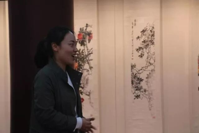 接 下来,就是最受同学期待的看展环节。同学们与两位老师边看边交流。高老师解释自己因为时间有限,山水画的不多,主要画大写意花鸟,画的是海上吴昌硕一路,他以荷花和紫藤图为例,解释写意与工笔的区别,尤其强调“书画同源”,书法对写意画的重要性。如荷梗是用篆书笔法写出来的,而紫藤用的是草书笔意。书法水平的高下往往决定了绘画作品的成败。