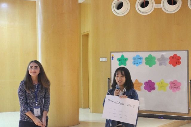 第一个环节是为时二十分钟的组内交流,各组组员进行自我介绍、推选组长并起好组名。倒计时结束,各组组长来到白板前郑重写下组名——做什么都队、邯郸国际队、优秀队……各组趣事层出不穷,引来场内阵阵笑声掌声。
